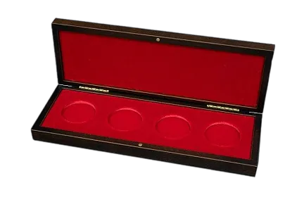 Внутреннее отделение обито красным бархатом, вмещает четыре капсулы диаметром 44 мм.