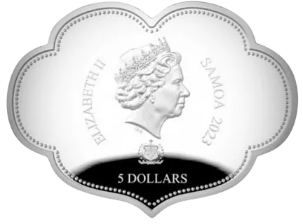 На аверсе серебряной монеты 2023 года «Доказательный дракон, предлагающий сокровища» весом 2 унции вы найдете портрет королевы Елизаветы II с рельефным правым профилем и герб Самоа. Характеристики монеты указаны вокруг этого изображения. Надписи гласят: САМОА 2023, 5 ДОЛЛАРОВ и ЕЛИЗАВЕТА II.