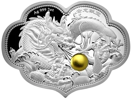 На реверсе изображена захватывающая сцена, где дракон смотрит на позолоченный шар. Вверху вы найдете подробную информацию о весе, чистоте монеты и китайских иероглифах, которые повышают ее культурное значение. Надписи включают AG 999 2 OZ.