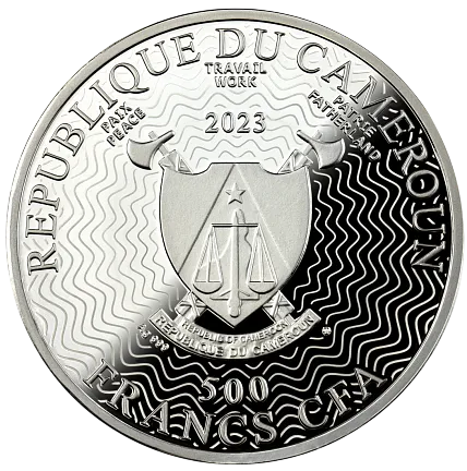 На аверсе монеты изображен герб Камеруна и надписи: «REPUBLIQUE DU CAMEROUN» — страна выпуска, «2023» — год выпуска и «500 FRANCS CFA» — номинал.