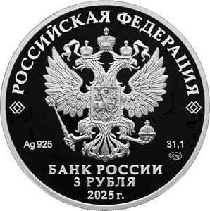 Аверс: рельефное изображение Государственного герба Российской Федерации, над ним вдоль канта – надпись полукругом «РОССИЙСКАЯ ФЕДЕРАЦИЯ», обрамленная с обеих сторон сдвоенными ромбами, под гербом слева – обозначения драгоценного металла и пробы сплава, справа – содержание химически чистого металла и товарный знак монетного двора, внизу в центре в три строки – надпись «БАНК РОССИИ», номинал монеты «3 РУБЛЯ», год выпуска «2025 г.».