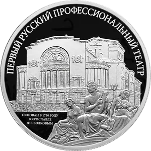 Реверс: рельефные изображения здания Российского государственного академического театра драмы имени Федора Волкова и аллегорической скульптурной группы, украшающей его фасад; вверху по окружности имеется рельефная надпись «ПЕРВЫЙ РУССКИЙ ПРОФЕССИОНАЛЬНЫЙ ТЕАТР», внизу слева в три строки – надпись «ОСНОВАН В 1750 ГОДУ В ЯРОСЛАВЛЕ Ф.Г. ВОЛКОВЫМ», выполненная в технике лазерного матирования.